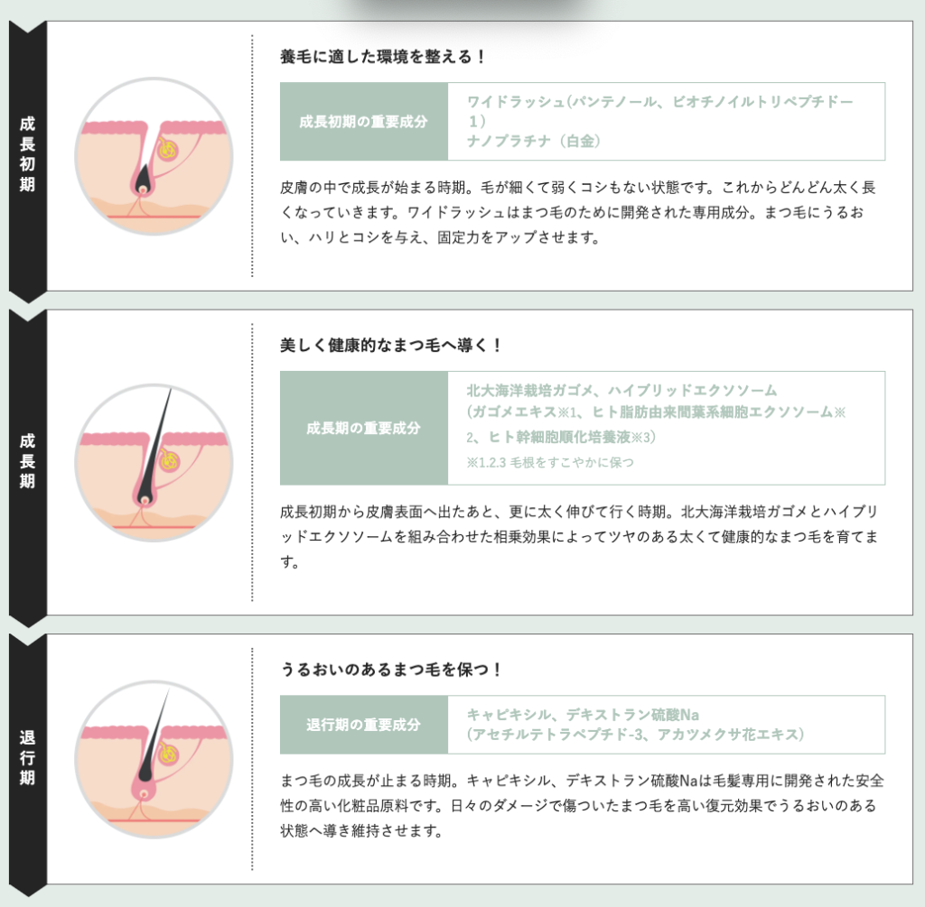 ラッシュリンクには、まつ毛周期の各段階にアプローチする11種類の贅沢成分※1を配合しています。