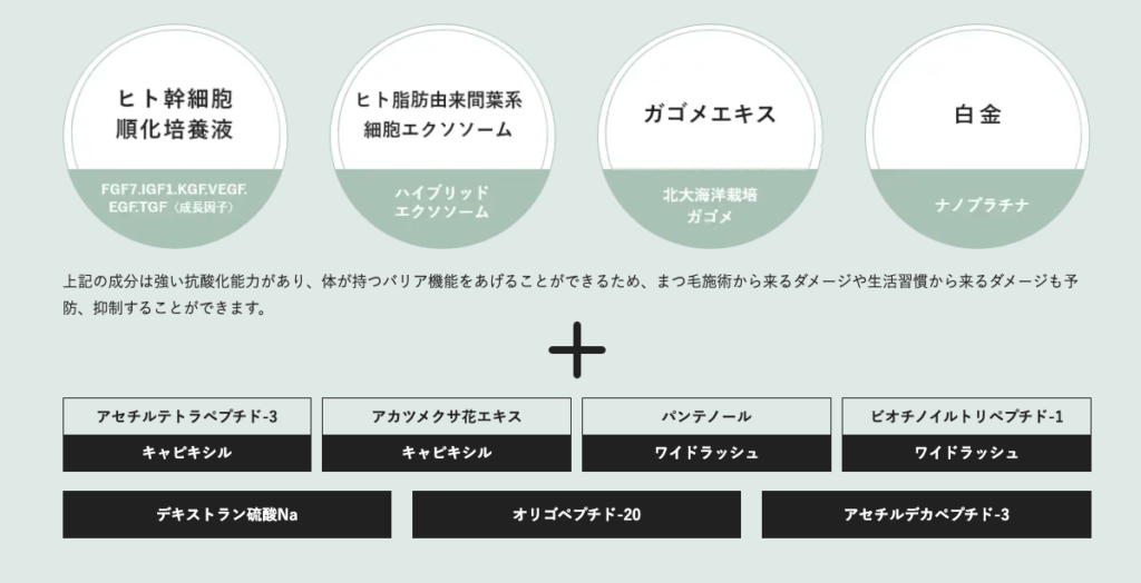とくにヒト幹細胞順化培養液※3やハイブリッドエクソソーム※4、ガゴメエキス※5は、まつ毛にうるおいを与えながら、ハリ・コシのある状態に導きます。